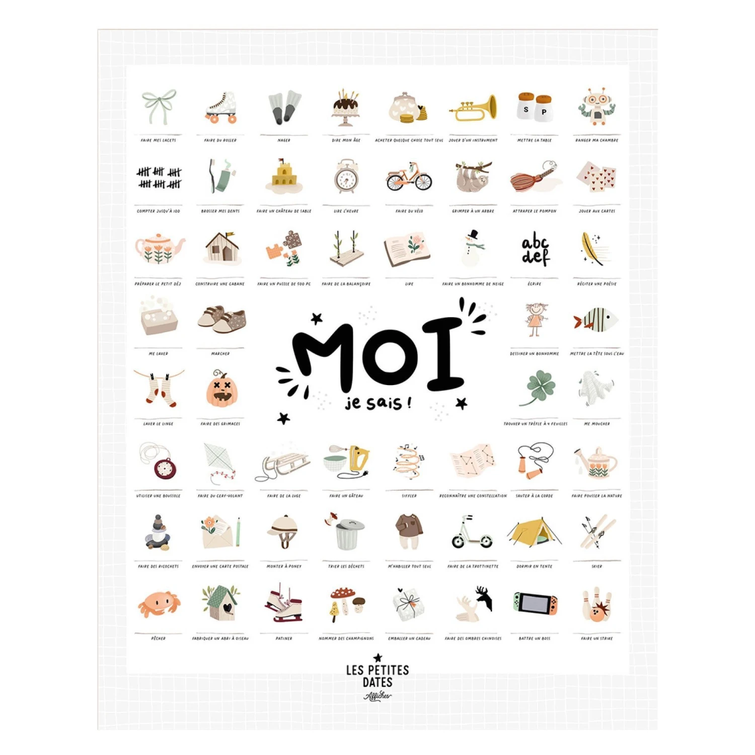 Optez pour l’affiche Mes premières fois à tamponner Moi je sais de la marque les Petites Dates? On oublie jamais les premières fois de son enfant… Les premiers pas, les premiers mots, les premières bêtises… et il y a encore toutes les autres ! Tamponnez les dates sous chaque évènement grâce à son tampon et encrier inclus. Vous pouvez facilement suspendre cette affiche Les Petites Dates grâce au porte-affiche en bois (vendu séparément).
