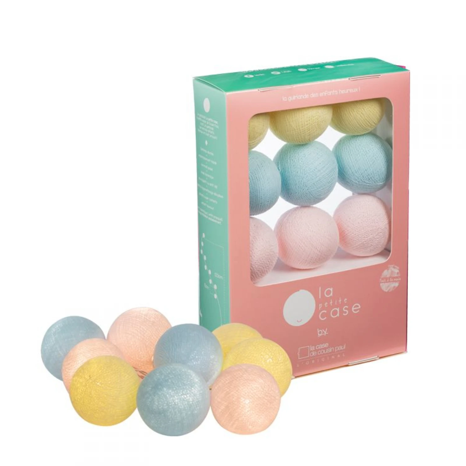 Découvrez ce coffret guirlande pour bébé 9 boules avec transformateur Céleste de la collection La petite case de la marque la case de cousin Paul. Dans ce coffret vous trouverez tout le nécessaire pour créer une guirlande lumineuse pastelles à votre petit bout. Le coffret comprend une guirlande de 9 ampoules LED ainsi que 9 boules pré-coupées de différentes couleurs et transformateur . L’interrupteur dispose de deux modes une mode timer de 3h. Cela vous permettra de créer une guirlande unique à l’image de bébé.